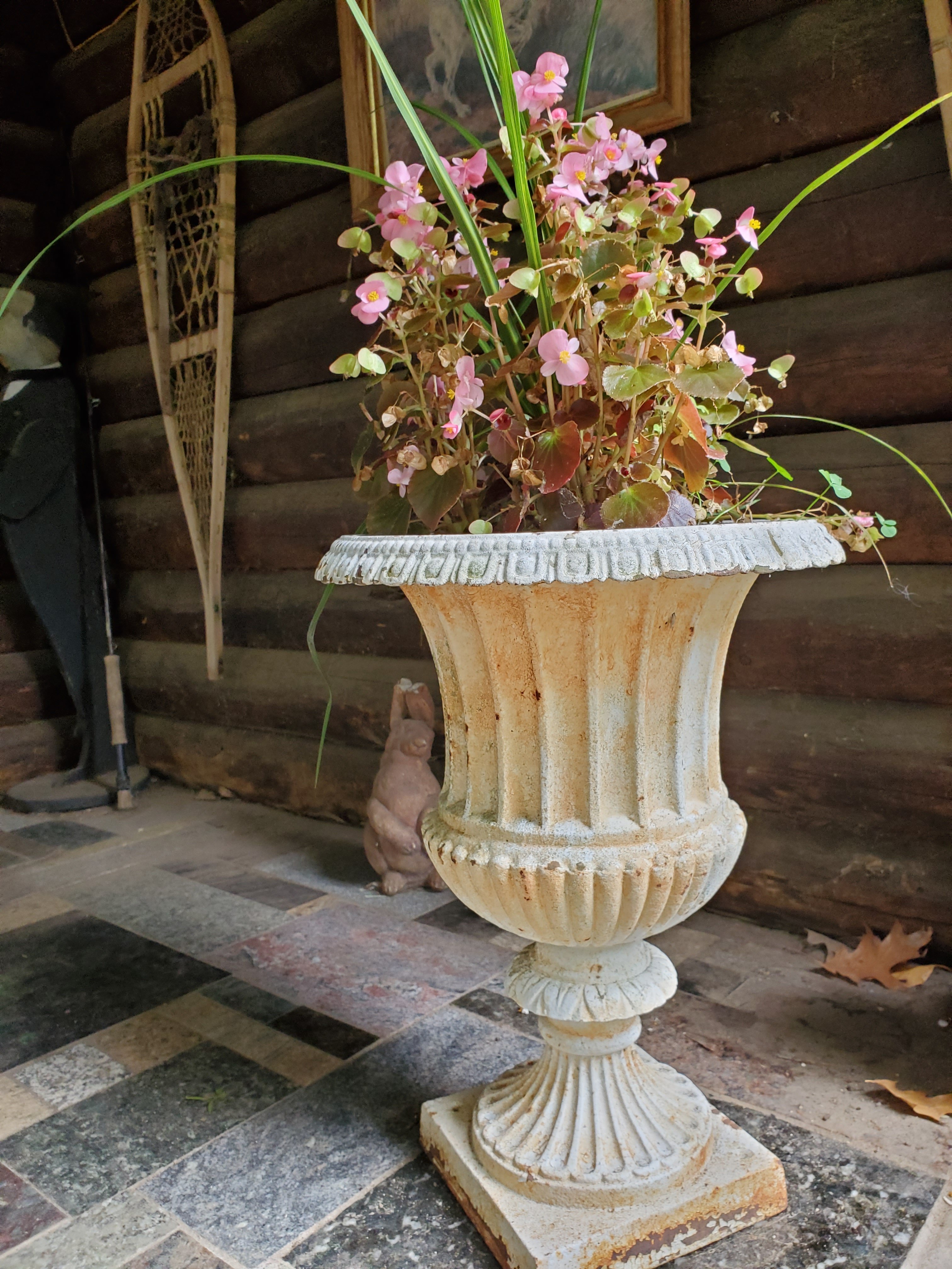 Drought ridden NH and thirsty potted flowers require innovation. Hence, there are tubs of water around the barn and studio. Four digging dogs, two of whom are renowned for partipation in mikicc.org, require gardening in pots.